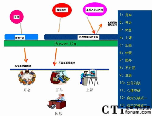 智能應(yīng)答業(yè)務(wù)是針對消費者不便通話時的一個增值業(yè)務(wù)。當(dāng)被叫用戶有來電時,因為自己的原因不便通話而掛斷電話后通過手機(jī)彈出的菜單,供用戶選擇與對方進(jìn)行的后續(xù)溝通。被叫用戶可以根據(jù)所處的情況選擇對應(yīng)的情景,系統(tǒng)將根據(jù)用戶選擇的情景對應(yīng)給主叫用戶發(fā)送短信和放音。智能應(yīng)答業(yè)務(wù)給了我們禮貌拒接的機(jī)會。當(dāng)您正在會議室里和客戶如火如荼的策劃下個項目,當(dāng)然不想被其他人打擾。突然有個電話打了進(jìn)來,接還是不接,不接有可能是一個潛在的客戶,接了又是對目前工作的一種打斷。如果你辦理了智能應(yīng)答業(yè)務(wù),當(dāng)你掛斷電話的同時手機(jī)上將出現(xiàn)一個菜單,你可以根據(jù)當(dāng)前具體情況選擇目前所處的情景(開車、開會、上課……等)。如你選擇了某種情景,系統(tǒng)將根據(jù)用戶選擇的情景,給主叫用戶播放相應(yīng)的語音通知(如:“您撥叫的用戶正在開會,請稍后再撥”)。