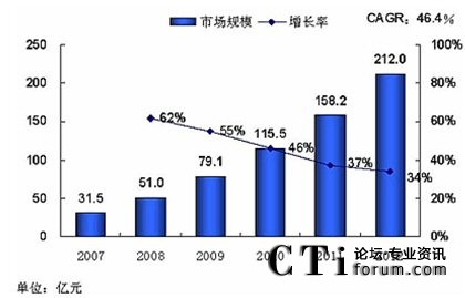 再來看看統(tǒng)一市場的前景,下圖是某咨詢公司對國內(nèi)統(tǒng)一通信市場的預(yù)測數(shù)據(jù),2012年將達(dá)到212億元,盡管可能存在一定水份,但這么多公司介入這個(gè)市場,本身就體現(xiàn)了發(fā)展?jié)摿,這點(diǎn)不容懷疑。