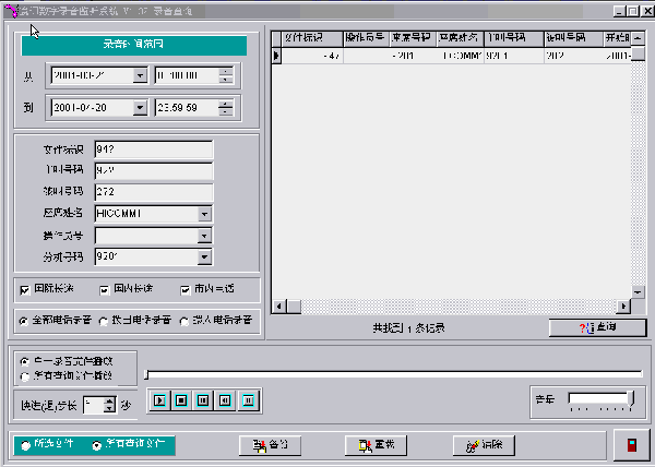 系統(tǒng)管理員可以對(duì)任一時(shí)間、任一電話的錄音進(jìn)行查詢。系統(tǒng)對(duì)每一次錄音都詳細(xì)記載了通話開始時(shí)間、結(jié)束時(shí)間、主叫或被叫號(hào)碼、通話的線路等,當(dāng)系統(tǒng)管理員在選中了某一條錄音后,可以進(jìn)行即時(shí)播放。