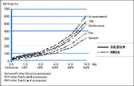 圖1顯示了主要的通信媒體處理功能的實(shí)驗(yàn)測量結(jié)果和預(yù)期性能。Intel 編制的HMP軟件,在Intel的從566 MHz 到 2 GHz的Celeron和 Pentium 處理器上,已經(jīng)對(duì)語音宣告、IVR和會(huì)議算法完成了實(shí)現(xiàn)、優(yōu)化和測試。圖1中的實(shí)線表示實(shí)驗(yàn)室中的測試結(jié)果。Intel的目標(biāo)是實(shí)現(xiàn)這些算法,并擴(kuò)展到更高速的Intel Pentium處理器,雙路、四路、甚至八路Intel Pentium處理器、Intel Xeon處理器以及Intel Itanium處理器。圖1中的虛線顯示了Intel所期望的在未來的實(shí)現(xiàn)中將得到的結(jié)果。目前,HMP的版本主要以Windows為主,很快就會(huì)推出Linux版本。從根本上說,HMP最適合用在純IP的環(huán)境,也可通過擴(kuò)展到多個(gè)服務(wù)器實(shí)現(xiàn)密度的提升。