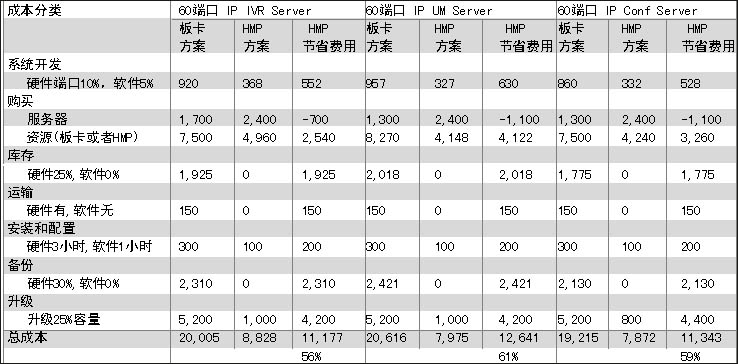 在眾多好處當(dāng)中,對(duì)用戶最有吸引力的無疑是節(jié)省成本。張怡國特別強(qiáng)調(diào),對(duì)一個(gè)應(yīng)用系統(tǒng)而言,成本的計(jì)算不應(yīng)該單以產(chǎn)品端口購買價(jià)格考核,而應(yīng)該是系統(tǒng)總的建設(shè)成本,包括產(chǎn)品購買成本、服務(wù)器成本、運(yùn)輸、安裝、庫存、升級(jí)等多項(xiàng)費(fèi)用;贖MP1.1版本,張怡國作了一個(gè)比較,以60端口IP IVR 60、端口IP UM或者60路會(huì)議為例,和語音板卡處理方式相比,基于HMP軟件實(shí)現(xiàn)能有近60%的成本節(jié)省,其中采購能節(jié)省20%,庫存節(jié)省20%,備份節(jié)省20%,升級(jí)節(jié)省近40%。