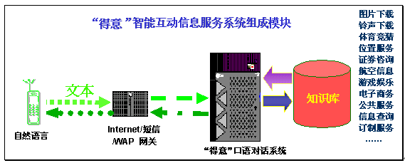 "得意"智能互動(dòng)信息服務(wù),是對(duì)用戶輸入的文本進(jìn)行自動(dòng)分析和理解,再?gòu)闹R(shí)庫(kù)中提取用戶所需的信息,然后自動(dòng)產(chǎn)生智能應(yīng)答語(yǔ)句,并以文本的形式通過(guò)電腦或者手機(jī)發(fā)回用戶。由于"得意"口語(yǔ)對(duì)話系統(tǒng)具有上下文相關(guān)理解和人機(jī)混合主導(dǎo)等強(qiáng)大功能,在指定的領(lǐng)域內(nèi),用戶可通過(guò)一次或者多次輸入(包括詞語(yǔ)、句子)構(gòu)成一組對(duì)話,完成復(fù)雜的信息查詢或者其他互動(dòng)信息服務(wù)。