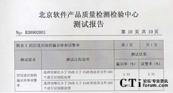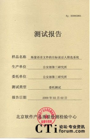CTI論壇(ctiforum)06月25日消息: 2009年3月02-10日:北京軟件產(chǎn)品質(zhì)量檢測檢驗中心對《海量語音文件的目標說話人篩選系統(tǒng)》進行了全面測試包括用戶文檔、功能性、可靠性、易用性、可維護性等多個特性。測試結(jié)果表明《海量語音文件的目標說話 2009年3月02-10日,北京軟件產(chǎn)品質(zhì)量檢測檢驗中心對《海量語音文件的目標說話人篩選系統(tǒng)》進行了全面人篩選系統(tǒng)》滿足軟件相關國家標準中的要求,系統(tǒng)在模擬測試環(huán)境中運行正常、穩(wěn)定,正式通過北京軟件產(chǎn)品質(zhì)量檢測檢驗中心的嚴格測試,系統(tǒng)的漏識率和誤警率分別達到了2.81%和 2.81%。