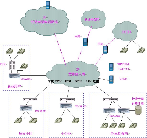 5. 促進骨干網(wǎng)VOIP運營商、ISP及寬帶運營商的資源共享,即ISP及寬帶網(wǎng)運營商通過在自己寬帶接入網(wǎng)絡(luò)上建設(shè)VOIP系統(tǒng),并將該系統(tǒng)接入骨干網(wǎng)VOIP運營商網(wǎng)絡(luò),可以為自己的寬帶網(wǎng)絡(luò)客戶提供除上網(wǎng)接入服務外的語音服務,在解決客戶/企業(yè)上網(wǎng)(內(nèi)部廣域網(wǎng)互連)的同時解決IP電話接入,從而實現(xiàn)包括客戶在內(nèi)的三方共贏;