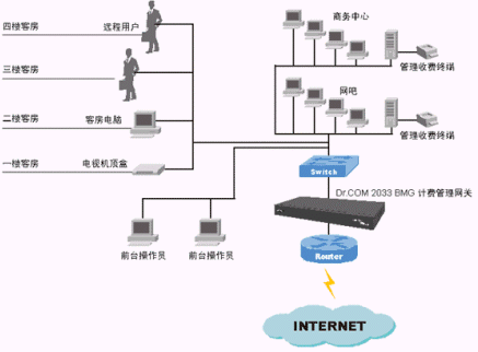 利用Dr.COM 2033BMG,配合路由器、五類(lèi)雙絞線(或者機(jī)頂盒、ADSL),實(shí)現(xiàn)計(jì)費(fèi)和客房Internet寬帶接入。