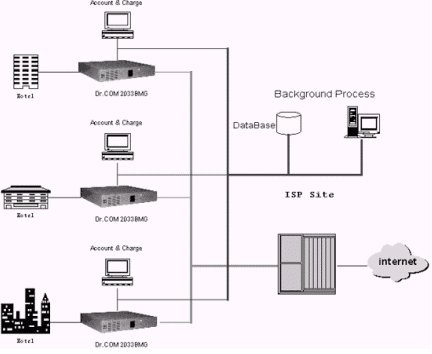 Dr.COM 2033BMG充當(dāng)驗(yàn)證計(jì)費(fèi)服務(wù)器的角色。它接受"前臺(tái)用戶結(jié)算終端"開(kāi)設(shè)的住客賬戶,在住客撥號(hào)登入時(shí)核對(duì)住客賬號(hào),實(shí)時(shí)地把住客上網(wǎng)的時(shí)間流量等信息返回給"前臺(tái)用戶結(jié)算終端",由后者按預(yù)定的計(jì)費(fèi)策略對(duì)住客收費(fèi)。