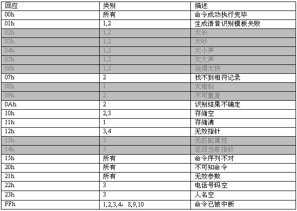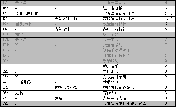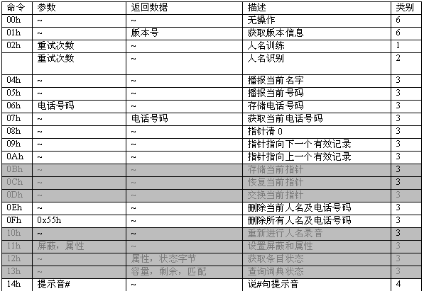 命令描述: 訓(xùn)練一個(gè)名字。當(dāng)增加一條電話本記錄時(shí),應(yīng)先執(zhí)行此命令。該命令會(huì)生成一個(gè)語音模板,同時(shí)產(chǎn)生一個(gè)長達(dá)2秒的名字錄音。在此命令成功執(zhí)行之后,MCPU接著發(fā)送06h命令增加電話號(hào)碼。如果沒有執(zhí)行06h命令,則該項(xiàng)記錄電話號(hào)碼為空。