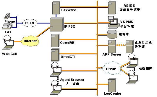 根據(jù)上述幾點,上海聲軟網(wǎng)絡技術有限公司(www.voicesoft.cn)的CommSuites for IPCC系統(tǒng)就是就是專門為中小企業(yè)量身定制的的IP呼叫平臺,CommSuites采用3COM的IP交換機NBX交換機為通信接入子系統(tǒng),結(jié)合CommSuites的CTI中間件,組成功能完善的IP呼叫中心平臺,下面是CommSuites for IPCC系統(tǒng)結(jié)構(gòu)圖: