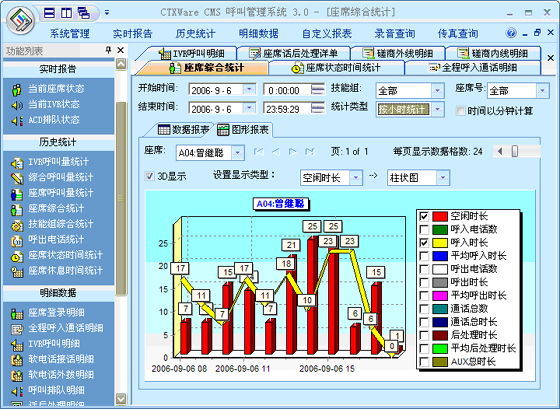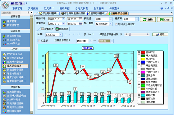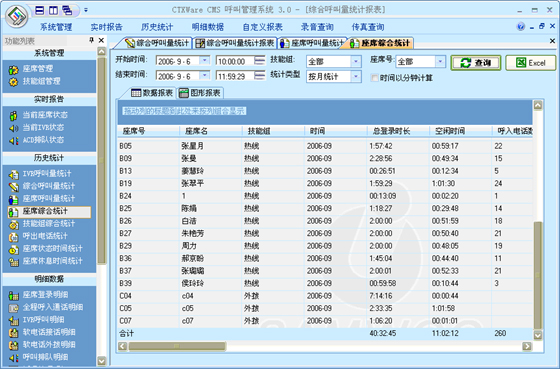 座席綜合統(tǒng)計:可以根據(jù)“月份”、“天”、“小時”來統(tǒng)計每一個座席的綜合指標。統(tǒng)計的指標包括:總登錄時長、空閑時長、呼入電話數(shù)、呼入時長、平均呼入時長、呼出電話數(shù)、呼出時長、平均呼出時長、通話總數(shù)、通話總時長、后處理時長、平均后處理時長、AUX總時長、電話振鈴時長、平均振鈴時長、轉(zhuǎn)移次數(shù)、磋商次數(shù)、保持次數(shù)、平均保持時長。