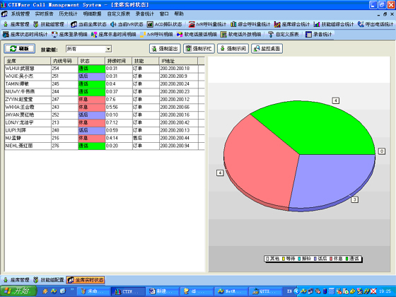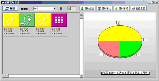 當前座席狀態(tài):能夠提供座席的狀態(tài)表示,狀態(tài)持續(xù)時間,對應的技能組,對應的分機號碼,對應的IP地址等信息?梢詫θ魏我粋座席進行強制簽出、強制示忙、強制示閑操作?梢詫θ我庾M行屏幕監(jiān)控操作(無需任何第三方軟件)。