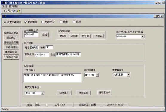 旅行社客戶服務(wù)中心系統(tǒng)將接入功能、導(dǎo)航功能、自動(dòng)語(yǔ)音查詢功能、人工座席服務(wù)功能、話路轉(zhuǎn)接功能、信息資料處理緊密聯(lián)系起來(lái)。用戶撥打特服電話號(hào)碼后,可以根據(jù)需要選擇人工服務(wù)、自動(dòng)語(yǔ)音查詢、自動(dòng)留言,并能夠在幾種服務(wù)中來(lái)回切換或轉(zhuǎn)接其它電話;所記錄的資料可以分門別類的進(jìn)行統(tǒng)計(jì)并形成報(bào)表,供相關(guān)部門進(jìn)行檢索查閱;意見(jiàn)處理完畢,可由座席主動(dòng)呼叫用戶,告知處理意見(jiàn),形成閉環(huán)處理流程;從而打造全新的客戶服務(wù)形象。