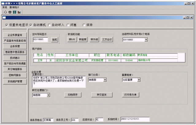 A 售前服務:由于系統(tǒng)以事先存入企業(yè)產(chǎn)品的宣傳資料,即使在無人值守的情況下,客戶亦通通過電話,傳真等方式獲取所需產(chǎn)品的詳細資料,實現(xiàn)全線產(chǎn)品的售前咨詢