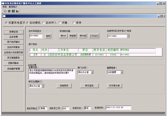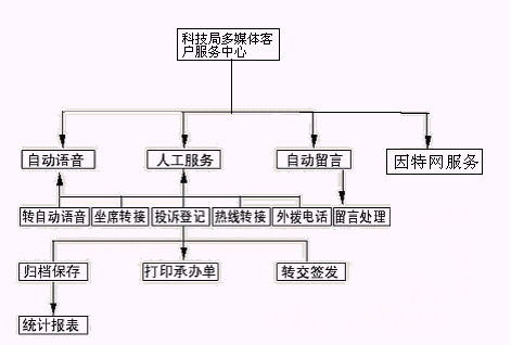 企業(yè)或個(gè)人打入電話后,可以選擇人工服務(wù),同座席話務(wù)人員直接溝通,由話務(wù)人員將企業(yè)或個(gè)人反映的問題和提出的建議意見記錄下來,并同時(shí)記錄下該客戶的聯(lián)系方式,將相關(guān)數(shù)據(jù)添加入系統(tǒng)數(shù)據(jù)庫;也可以在數(shù)據(jù)庫的支持下回答企業(yè)或個(gè)人對科技成果和政策法規(guī)的咨詢和疑問。企業(yè)或個(gè)人也可以選擇自動(dòng)語音服務(wù)方式,根據(jù)系統(tǒng)的語音提示輸入按鍵,選擇類別,將自己的投訴和建議以及自己的聯(lián)系方式信息以留言錄音的方式保存在系統(tǒng)中。系統(tǒng)同時(shí)還支持自動(dòng)傳真方式,企業(yè)或個(gè)人可以通過傳真機(jī)打通客戶服務(wù)中心,通過按鍵選擇傳真方式,將自己的意見建議等的文本內(nèi)容傳真給系統(tǒng),系統(tǒng)自動(dòng)接受并存入數(shù)據(jù)庫。