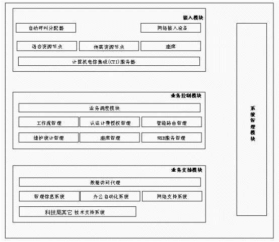 系統(tǒng)管理模塊提供對全系統(tǒng)完善的設(shè)備管理、網(wǎng)絡(luò)管理、運(yùn)營維護(hù)管理、服務(wù)質(zhì)量管理、業(yè)務(wù)信息管理及決策分析等功能,幫助科技局客戶服務(wù)中心運(yùn)營者用好系統(tǒng),把握市場動(dòng)態(tài),不斷提高服務(wù)質(zhì)量。