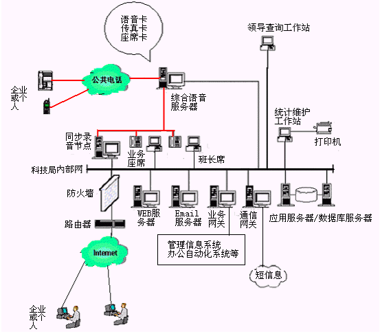 應(yīng)用現(xiàn)代先進(jìn)的CTI技術(shù)建立的科技局公開電話系統(tǒng),改變了傳統(tǒng)的科技局辦公的一部電話、一支筆、一個(gè)本(或用計(jì)算機(jī)當(dāng)打字機(jī))的記錄、交流模式。在充分利用各級科技局現(xiàn)有辦公自動(dòng)化系統(tǒng)基礎(chǔ)上,通過共享科技局、社會(huì)網(wǎng)絡(luò)資源,能夠?yàn)槠髽I(yè)或個(gè)人提供了更多、更好、更便捷的服務(wù)。