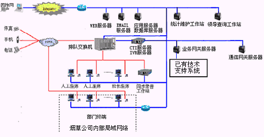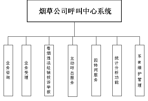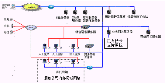 卷煙經銷戶等客戶利用電話、傳真、電子郵件、因特網、手機、短消息等撥打統(tǒng)一的特服號碼(如800XXX或9XXXX)進入煙草公司呼叫中心,本系統(tǒng)依托煙草公司各類業(yè)務技術支持系統(tǒng)和網絡系統(tǒng),實現(xiàn)煙草專賣局原有管理系統(tǒng)/業(yè)務系統(tǒng)及數(shù)據(jù)庫的無縫連接,通過人工受理或自動語音服務等方式全天24小時不間斷地為客戶提供各種服務。