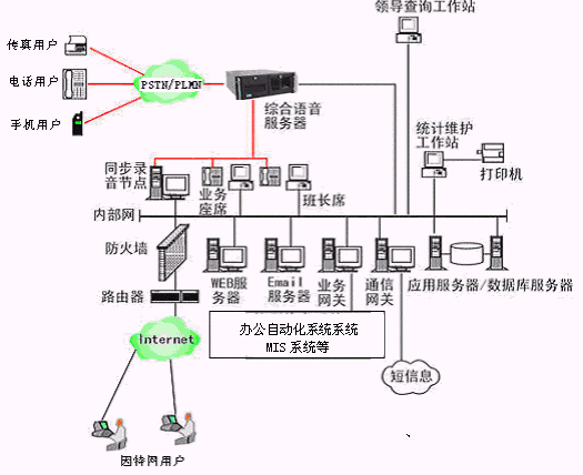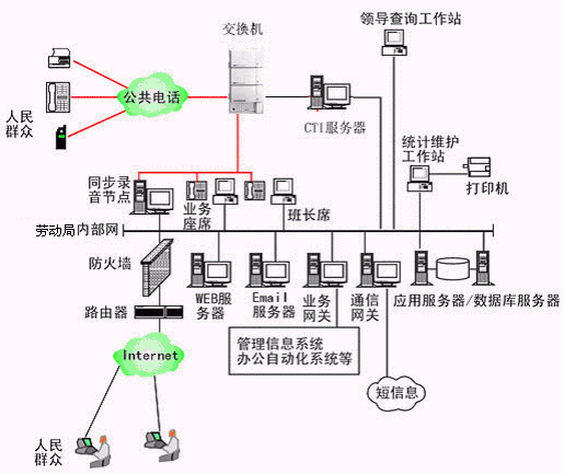 勞動(dòng)局多媒體呼叫中心系統(tǒng)主要是由智能型可編程交換機(jī)或帶語(yǔ)音板卡的工控機(jī)或排隊(duì)交換機(jī)、CTI服務(wù)器、IVR(交互式語(yǔ)音應(yīng)答)/IFR(交互式傳真應(yīng)答)子系統(tǒng)、人工座席子系統(tǒng)、應(yīng)用服務(wù)器、數(shù)據(jù)庫(kù)服務(wù)器、業(yè)務(wù)網(wǎng)關(guān)子系統(tǒng)、WEB服務(wù)器、電子郵件服務(wù)器、防火墻、通信網(wǎng)關(guān)等硬件設(shè)備和應(yīng)用軟件組成。