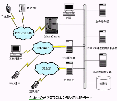 為了描述彩話業(yè)務(wù)系統(tǒng)BYBGM2.0的呼叫流程,將彩話業(yè)務(wù)系統(tǒng)BYBGM2.0網(wǎng)絡(luò)邏輯框架圖經(jīng)過簡化成為下列網(wǎng)絡(luò)拓撲結(jié)構(gòu)圖: