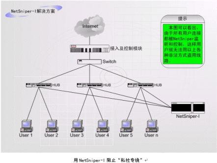 NetSniper-I適用于檢測(cè)和控制私拉專(zhuān)線。NetSniper-II適用于檢測(cè)和控制共享上網(wǎng)和盜用MAC地址上網(wǎng)。