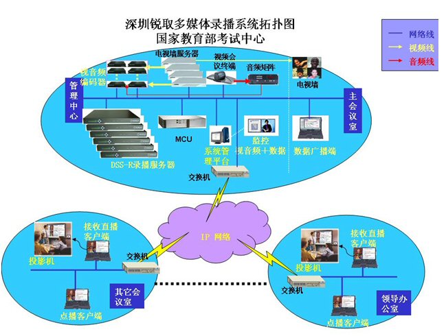 國家教育部考試中心為了對高考等大型考試實時性指導、監(jiān)考、培訓等,特建立了視頻會議系統(tǒng)、監(jiān)考系統(tǒng)。為了使整個系統(tǒng)更完善、應用價值更高,因此在此基礎上配置了銳取多媒體錄播系統(tǒng)。不僅實現了與各地考試中心及考點的圖像、語音和數據的交互通訊,還可以輔助系統(tǒng)完成視頻會議、監(jiān)考系統(tǒng)及培訓的錄制、直播和點播功能,錄制、直播和點播的內容包括了所有考試中心、考點圖像以及聲音和數據信號。