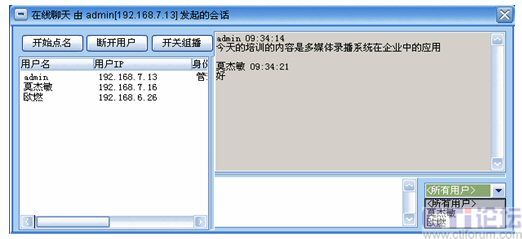 系統(tǒng)增加了多方文字互動聊天功能,在線聊天功能可以選擇給所有人員發(fā)送消息,也可以選擇給某一特定人員發(fā)送。這樣在會議或培訓的過程中,管理員可以選擇性的提出相應的問題給相關人員,考核相關人員的培訓效果;其他人員也可以將會議或培訓過程中遇到的疑問、難點及時的反應給管理員進行解答,增強會議的成效。