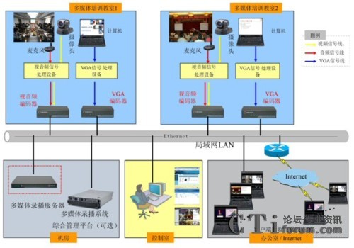 如上圖所示,銳取多媒體錄播成功實現(xiàn)了中國電力投資集團高級培訓中心兩間多媒體教室內(nèi)培訓課程的錄制、直播和后期點播。銳取多媒體錄播前端的編碼器部署在多媒體教室,編碼器采集培訓的PPT和老師講課的圖像聲音編碼后通過網(wǎng)絡(luò)傳送給機房的多媒體錄播服務(wù)器,多媒體錄播服務(wù)器實現(xiàn)培訓過程中“教師學生圖像聲音+老師講稿(PPT)”的同步錄制、直播、點播。
