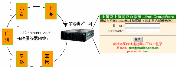 (1) 在不改變現(xiàn)有網(wǎng)絡(luò)硬件、軟件環(huán)境的情況下,添加一臺(tái)郵件網(wǎng)關(guān)服務(wù)器,通過統(tǒng)一的web登陸界面,輸入Email地址和密碼后,金笛?郵件網(wǎng)關(guān)會(huì)自動(dòng)根據(jù)內(nèi)部DNS找到該用戶所在的Domino Mail Server, 并通過標(biāo)準(zhǔn)郵件協(xié)議POP3提取該用戶的郵件,以web頁面形式顯示在用戶屏幕上。