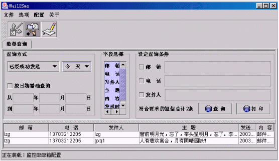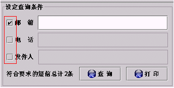·也可以通過(guò)給定查詢條件來(lái)查詢某項(xiàng)內(nèi)容,如針對(duì)某個(gè)郵箱、手機(jī)電話或發(fā)件人,方法是通過(guò)點(diǎn)擊左邊的小方框來(lái)選中,然后輸入相應(yīng)內(nèi)容即可,如下圖: