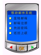 進(jìn)入移動郵件系統(tǒng)后,可分別選擇"登陸郵箱、郵箱注冊、找回密碼、返回上級"來進(jìn)行下一步操作。