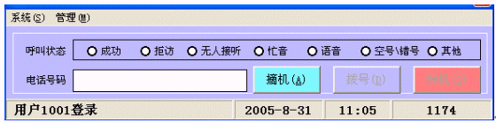 - 坐席功能,坐席人員通過(guò)電腦鼠標(biāo)操作,取新客戶資料,點(diǎn)擊撥號(hào),同時(shí),用鼠標(biāo)操作記錄撥號(hào)過(guò)程和通話過(guò)程的一些設(shè)置(撥號(hào)成功、忙線、無(wú)人接、客戶反饋信息等)。坐席電腦將分類(lèi)顯示忙線電話列表、無(wú)人接電話列表、感興趣客戶列表等信息,以便做下一輪撥號(hào)參考。
