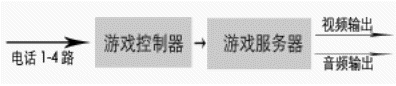 由于許多地區(qū),尤其是縣級(jí)市沒(méi)有信息平臺(tái),而且許多電視臺(tái)愿與電話局直接合作。在這種情況下,電話局和電視臺(tái)合作對(duì)有線用戶公布 特服號(hào)碼,如123456,參與互動(dòng)游戲的用戶,統(tǒng)一撥打該號(hào)碼,電話局提供四條用戶線給互動(dòng)游戲系統(tǒng),同時(shí)對(duì)撥打123456的用戶都轉(zhuǎn)到這四條用戶線來(lái),從而接入到互動(dòng)游戲系統(tǒng),由系統(tǒng)給出語(yǔ)音提示引導(dǎo)用戶參與比賽。由于系統(tǒng)最多允許四個(gè)人參與比賽,當(dāng)用戶滿時(shí),撥打游戲熱線的用戶