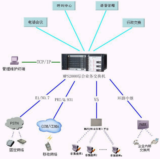 該項方案是基于邁可行通信自主研發(fā)的MPS2000交換平臺上的,MPS2000采用了接口與資源相分離、業(yè)務(wù)和平臺相分離,使得以后的容量的擴容和業(yè)務(wù)的更改拓展更加方便。
