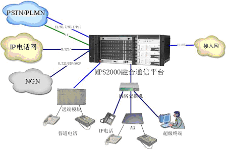 MPS2000融合通信平臺組網(wǎng)能力強大,能夠提供數(shù)字中繼、模擬中繼(包括環(huán)路中繼、二/四線中繼等各種模擬中繼)、IP中繼等硬件接口,在信令協(xié)議上支持NO.7、NO.1、Pri等信令以及H.323、SIP、MGCP等協(xié)議。平臺能夠與數(shù)字網(wǎng)、模擬網(wǎng)、數(shù)模混和網(wǎng)、IP電話網(wǎng)、NGN(下一代網(wǎng)絡)等現(xiàn)有的各種網(wǎng)絡進行組網(wǎng)。
