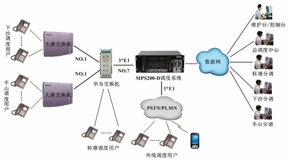 杭州繞城高速公路分成東西南北四段,此次,需要調(diào)度轉(zhuǎn)塘、下沙、半山等分處。目前,MPS2000-D指揮調(diào)度系統(tǒng)通過(guò)3個(gè)E1與華為交換機(jī)相連,基于原有通信網(wǎng)絡(luò),實(shí)現(xiàn)轉(zhuǎn)塘、下沙、半山調(diào)度用戶的接入。同時(shí),指揮調(diào)度系統(tǒng)通過(guò)1個(gè)E1出局,實(shí)現(xiàn)外線調(diào)度用戶的接入,本次項(xiàng)目調(diào)度用戶共設(shè)置了120門(mén)。