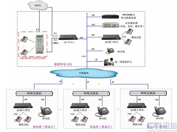巢湖電力市區(qū)下屬15個(gè)供電營業(yè)廳以及一個(gè)局屬單位。在信息中心配置可以I+1 熱備的MPS2000-X軟交換系統(tǒng),通過TG提供的E1與華為的C&C08對(duì)接出局,在每個(gè)供電營業(yè)廳放置AG 15套。系統(tǒng)建成后將華為的行政電話延伸到各個(gè)供電營業(yè)廳,各營業(yè)廳之間、供電公司和營業(yè)廳之間分機(jī)號(hào)碼互撥,有來電顯示,系統(tǒng)充分利用原有的通信網(wǎng)絡(luò)資源,節(jié)約投資及成本。