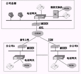 本方案采取IP語音接入的方法,利用88IP動(dòng)態(tài)域名解析系統(tǒng),將IPMUX電話網(wǎng)關(guān)的網(wǎng)絡(luò)接口接入到公司和分部(分公司)的局域網(wǎng)中,通過ADSL、ISDN、撥號(hào)上網(wǎng)等方式,同連接在此因特網(wǎng)上的其它IPMUX電話網(wǎng)關(guān)相連,從而將不同地域的電話連接在一起,組成整個(gè)公司的IP電話網(wǎng),以達(dá)到免費(fèi)通話的目的。