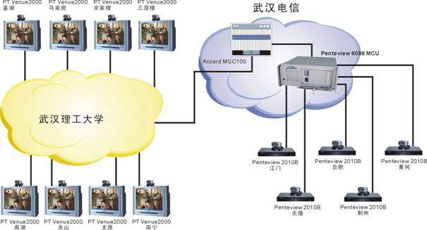 武漢理工大學的遠程教學系統(tǒng)由于分3期建設,網(wǎng)絡條件較為復雜。一期主要以PT的Venue2000終端+Accord MGC100 MCU為主,是一個H323系統(tǒng);二、三期采用中太多媒體的Penteview2010終端+Penteview6088MCU,是一個H320系統(tǒng),兩套系統(tǒng)通過網(wǎng)關(guān)無縫結(jié)合到一起工作,用戶根本感覺不到不同。各教室均同時采用了中太多媒體的遠程教學支撐系統(tǒng),通過對Penteview會議電視系統(tǒng)的擴充,實現(xiàn)了以下功能,使教學應用更加方便: