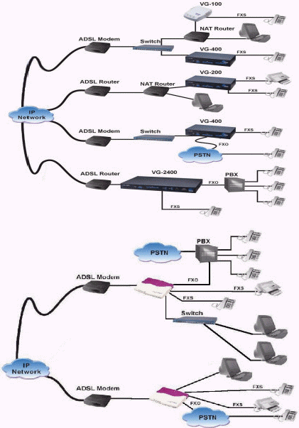 利用企業(yè)已有網絡(或新建網),接入VG400語音網關系列設備,將總部和分部之間的業(yè)務網提升為一個數(shù)據(jù)話音綜合網,使總部和分部之間構成一個企業(yè)內部的電話網。免去企業(yè)內部的長話和市話費用,更使企業(yè)內部業(yè)務管理、辦公自動化提升到一個更高的水平。