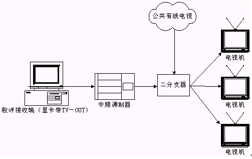 本系統(tǒng)接收端接收實時廣播時,除了用普通PC機收看,或把PC機接收到的信號輸?shù)诫娨暎ù笃粒┥鲜湛矗踔吝可以接入有線電視網(wǎng)進行播放。具體方法是通過一個接收端接收股評節(jié)目,通過帶TV-OUT的顯卡把TV信號輸出到中頻調(diào)制設(shè)備,中頻調(diào)制設(shè)備可以把基帶模擬信號轉(zhuǎn)換成一個有線電視信號,且傳輸距離遠,損失小,再把這個信號與有線電視信號一起接入一個二分支器(2進1出),這就可以和公共有線電視共存,形成自己的頻道,供電視接收。