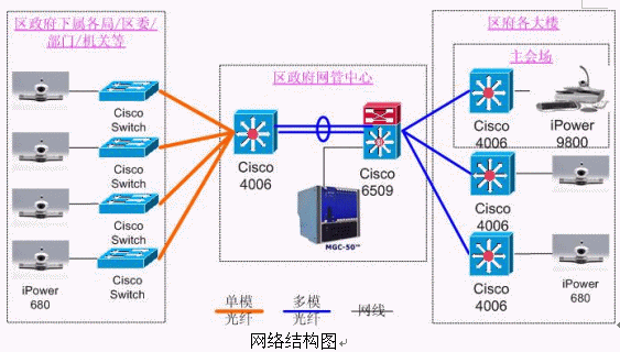 9800,分會場使用iPower 680。網(wǎng)管中心安放一臺Polycom 公司的MGC-50(多點會議控制單元),用于對全網(wǎng)終端的控制,實現(xiàn)多點間、點對點會議。各視頻設(shè)備通過網(wǎng)線連接在各主要交換機(jī)上。