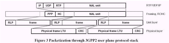 因為包交換服務(wù),3GPP/3GPP2同意了一個基于IP的協(xié)議棧。圖3展示了一個NAL單元通過3GPP2用戶平面協(xié)議堆棧被封裝在RTP/UDP/IP的典型過程。在頭壓縮(RoHC)后,此IP/UDP/RTP包被封裝進一個PDCP/PPP2包,變成了頻率鏈路控制(RLC)和服務(wù)數(shù)據(jù)單元(SDU)。RLC協(xié)議可以在三種模式下工作:透明、非確認和確認模式。RLC協(xié)議為用戶和數(shù)據(jù)提供分段和重傳服務(wù)。在透明和非確認模式,RLC被定義為單向的;在確認模式,RLC被定義為雙向的。對於所有的RLC模式,循環(huán)冗余檢查(CRC)的錯誤檢測在物理層上被運行,而且CRC檢查的結(jié)果和真實的數(shù)據(jù)一起被遞送到 RLC。在透明模式中,沒有上層的協(xié)議被增加到較高層的數(shù)據(jù)中。錯誤的協(xié)議數(shù)據(jù)單元(PDUs)可以被丟棄或標記為錯誤。在非確認模式中,沒有重傳協(xié)議在使用中,而且數(shù)據(jù)傳送沒有保證。接受到的錯誤數(shù)據(jù)根據(jù)配置來決定丟棄或標記為錯誤。在確認模式中,一種自動的重復(fù)請求機制被用于錯誤訂正。