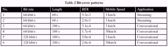 在H.264/AVC的標準化進程中,移動視頻傳輸?shù)闹匾砸呀?jīng)在3G移動傳輸里面通過對基于H.324M的電路交換會話服務(wù)、包交換會話和流服務(wù)得到了證實。這些測試情況允許適當?shù)木幋a特征、測試和容錯仿真等特征的選擇,同時也可以得到有意義的測試結(jié)果。在本文,我們將會把重心集中在基于IP的測試情況。在正常的測試情況下,我們會定義6個測試情形組合,主要測試通過3G移動網(wǎng)絡(luò)的包交換會話服務(wù)和包交換流媒體服務(wù)。另外,測試環(huán)境包括簡單的脫機3GPP/3GPP2仿真軟件、程序接口和評估標準。無線信道使用專門生產(chǎn)用于移動無線信道仿真的位率差錯模板來進行仿真。 位率差錯模板在物理層上和RLC/RLP層下來捕獲,因此,它們在實驗被用于物理層仿真。通過位率差錯模板實驗中得出的碼率、長度、位錯誤率和移動速度數(shù)據(jù)詳見下表2。
