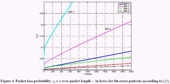數(shù)組3到6的仿真結(jié)果更可靠,在會話應(yīng)用中需要低錯誤率的運送者。 假定一任意的字節(jié)的開始位置在文件包可能發(fā)生錯誤的位置里面。 這些錯誤可能性的所有數(shù)據(jù)錯誤在圖4中被顯示。 明顯可以看出錯誤率會因為包長度的增加而提高。從位率錯誤表格(BEP1和2)可知,當包長度減少的時候丟包率是不可以接受的, 舉例來說,500個字節(jié), 丟失可能性高達25%. 高的錯誤率需要在鏈路層上重傳。