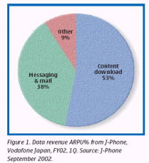 2002年第一季度,短信服務ARPU值占所有數(shù)據(jù)服務收入的19.1%,郵件服務占38%,而內(nèi)容下載服務則達到了53%。(信息來源:2002年9月J-Phone)