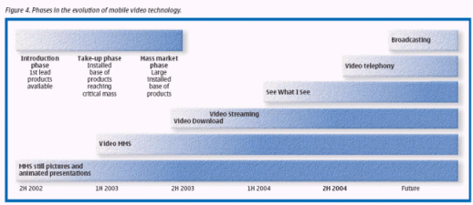 早期的市場試驗和市場調查都已顯示,用戶愿意消費和支付移動視頻服務。用戶通過MMS接受的視頻片斷消費被視為首個大規(guī)模市場服務,緊接著就是通過下載和流媒體接受的視頻斷片。這對開展例如移動視頻服務行業(yè)工作,和取得現(xiàn)成移動用戶市場都是非常重要的。隨著EDGE/WCDMA網(wǎng)絡的部署和智能手機的不斷普及,移動視頻服務在移動增值領域占據(jù)的地位將越來越重要。