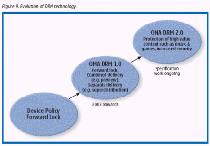 圖9簡要概述了DRM技術的發(fā)展經(jīng)過。迄今為止,市場已經(jīng)為保護內(nèi)容提供了各種各樣的版權解決方案。其中一種值得提及的解決方案是"device policy