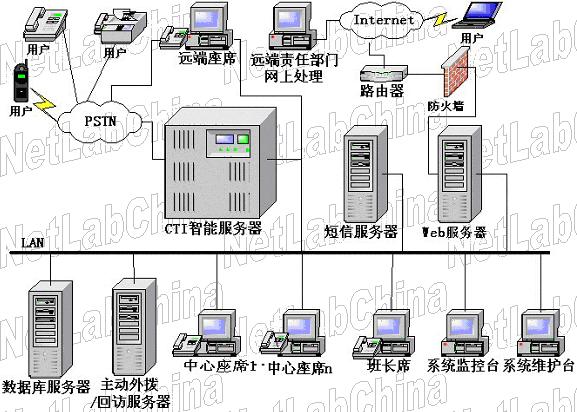 客服中心系統(tǒng)硬件設(shè)備由以下核心部件組成:通信智能服務(wù)器、數(shù)據(jù)庫(kù)服務(wù)器、微機(jī)、電話機(jī)。