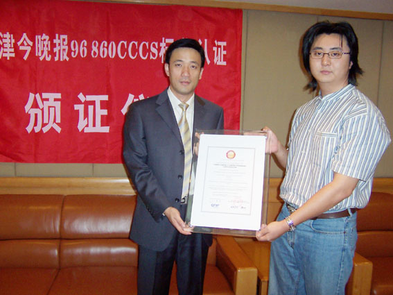 2004年9月9日,天津今晚報(bào)公眾服務(wù)中心通過(guò)了《全國(guó)呼叫中心運(yùn)營(yíng)績(jī)效標(biāo)準(zhǔn)》(CCCS-OP-2003)認(rèn)證,并獲得由中國(guó)信息化推進(jìn)聯(lián)盟客戶關(guān)系管理專(zhuān)業(yè)委員會(huì)頒發(fā)的認(rèn)證證書(shū)(四星級(jí)客戶服務(wù)中心),成為國(guó)內(nèi)傳媒業(yè)首家通過(guò)此認(rèn)證的呼叫中心。