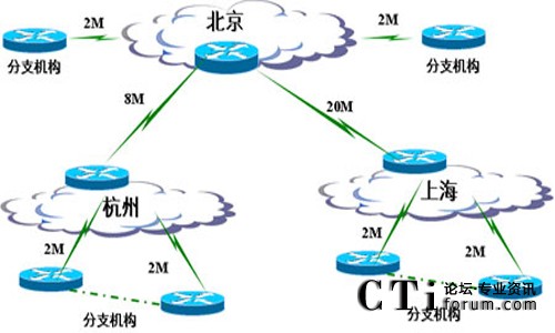 網(wǎng)絡(luò)結(jié)構(gòu)為星形為主,部分節(jié)點(diǎn)為樹狀。深圳總部作為主會(huì)議中心,以星形方式連接到營業(yè)部分會(huì)議中心,廣州地區(qū)30家營業(yè)部通過2M線路連接到廣州中心機(jī)房,廣州中心通過64M的線路連接到深圳總部;北京15家營業(yè)部通過4M線路連接到北京中心機(jī)房,北京中心機(jī)房通過10M線路連接到深圳總部,未來北京地區(qū)的15家營業(yè)部也要調(diào)整為直接連接到深圳總部;深圳9家營業(yè)部通過4M線路連接到深圳中心機(jī)房,深圳中心機(jī)房通過64M線路連接到深圳總部。