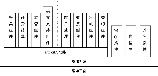 長話計費系統(tǒng)既包括計費結(jié)算系統(tǒng),又包括營業(yè)服務(wù)系統(tǒng),功能比較多,數(shù)據(jù)處理流程也相對復(fù)雜。 簡單的傳統(tǒng)數(shù)據(jù)庫的機(jī)械化編程已很難滿足系統(tǒng)對大數(shù)據(jù)量的處理及靈活性等方面的要求,因此在這套系統(tǒng)中,我們采用了一些當(dāng)今業(yè)界的熱門技術(shù)。比如采用了CORBA軟總線思想和MQ Series消息管理隊列,也使之成為聯(lián)機(jī)計費系統(tǒng)平臺的一次成功實施。其系統(tǒng)層次結(jié)構(gòu)圖如下: